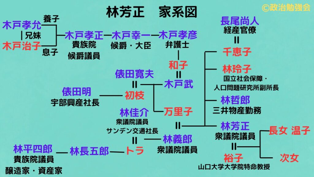 林芳正氏の家系図には、明治維新の立役者である木戸孝允(桂小五郎)氏との親戚関係が存在します。具体的には、林芳正氏の母方の伯父が木戸家に婿入りしており、この木戸家は木戸孝允氏の血筋を受け継いでいます。​